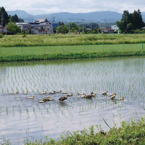 あいがも農法とは、栽培期間中は農薬・化学肥料を一切使用せず、あいがもを水田に放し飼いにすることで雑草や虫を食べて、稲の成長を助ける農法です。