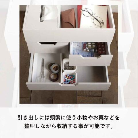大小3つの引き出しや、ボックスティッシュも収納可能です。