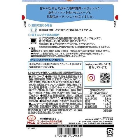 クラムチャウダー:エネルギー198kcal、たんぱく質3.8g、脂質12.5g、炭水化物17.6g、食塩相当量1.3g