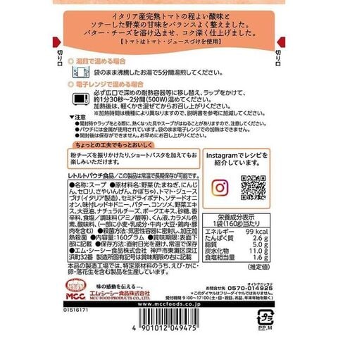 ミネストローネ:エネルギー99kcal、たんぱく質2.6g、脂質5.0g、炭水化物11.0g、食塩相当量1.6g