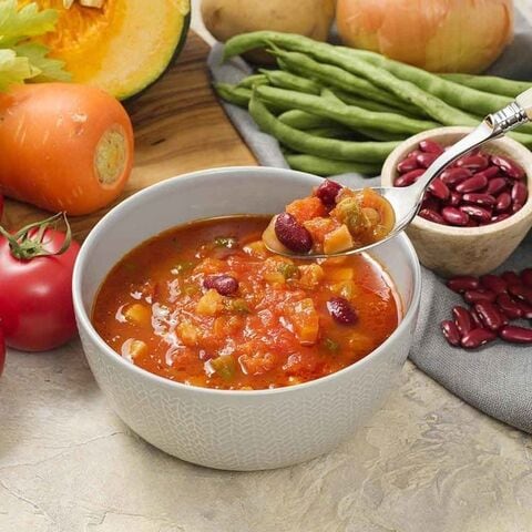 野菜(たまねぎ、にんじん、セロリ、さやいんげん、かぼちゃ)、トマト・ジュースづけ(イタリア製造)、セミドライポテト、ソテードオニオン、味付レッドキドニー、バター、コンソメ、野菜エキス、大豆油、ナチュラルチーズ、ポークエキス、砂糖、香辛料、食塩/調味料(アミノ酸等)、くん液、カラメル色素、酸味料、(一部に小麦・乳成分・牛肉・大豆・鶏肉・豚肉を含む)
