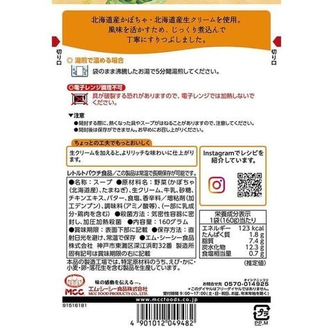 北海道産かぼちゃのスープ:エネルギー123kcal、たんぱく質1.8g、脂質7.4g、炭水化物12.3g、食塩相当量0.7g