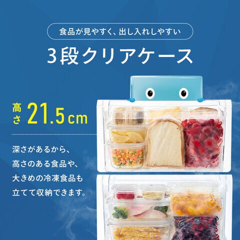 トレーは3段すべて高さ21.5cmで深さがあるから、高さのある食品や大きめの冷凍食品も立てて収納できる。