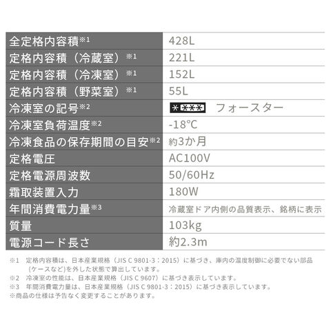 ※1 定格内容積は、日本産業規格(JIS C 9801-3:2015)に基づき、庫内の温度制御に必要でない部品(ケースなど)を外した状態で算出しています。