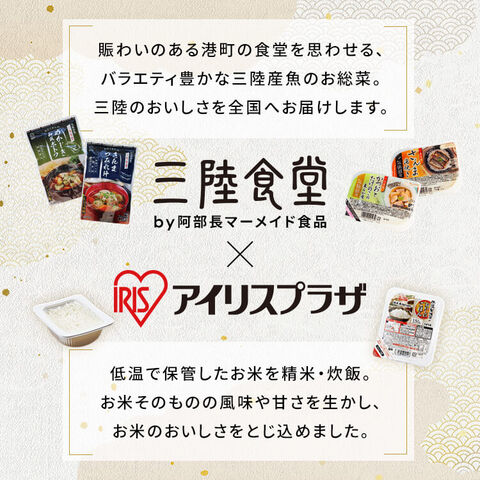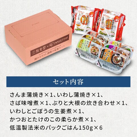 アイリスオーヤマのパックご飯と阿部長マーメイド食品の「さんま蒲焼」「さば味噌煮」「いわし蒲焼」「かつおとたけのこの柔らか煮」「いわしとごぼうの生姜煮」「ぶりと大根の炊き合わせ」6種をセットにしました。