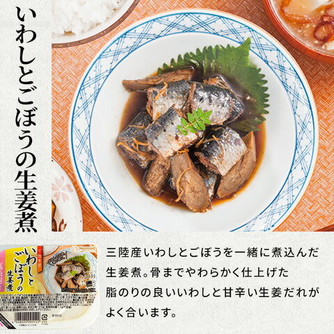 【いわしとごぼうの生姜煮】いわし(国産)、ごぼう、甘露煮たれ(砂糖、しょうゆ、水あめ、その他)、生姜、食塩、醸造酢/増粘剤(加工でん粉)、(一部に小麦・大豆を含む)