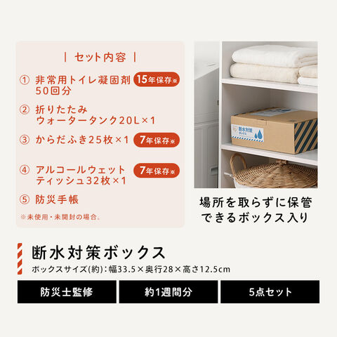 ●セット内容:非常用トイレ凝固剤50回/長期保存アルコールウェットティッシュ/長期保存からだふき/ウォータータンク20L/防災手帳