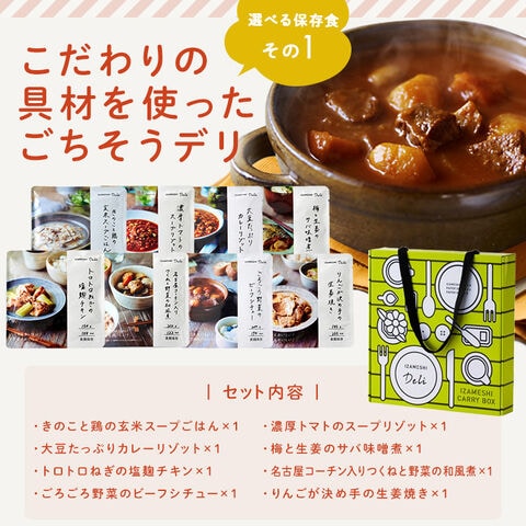 きのこと鶏の玄米スープごはん/濃厚トマトのスープリゾット/大豆たっぷりカレーリゾット/梅と生姜のサバ味噌煮/トロトロねぎの塩麹チキン/名古屋コーチン入りつくねと野菜の和風煮/ごろごろ野菜のビーフシチュー/りんごが決め手の生姜焼き