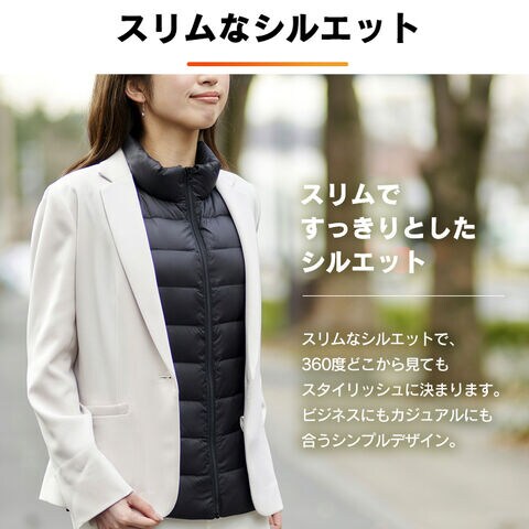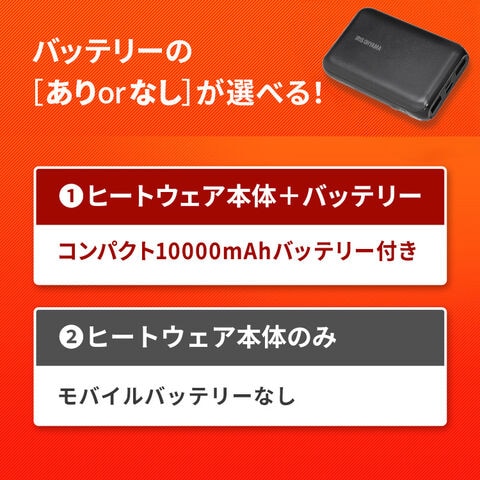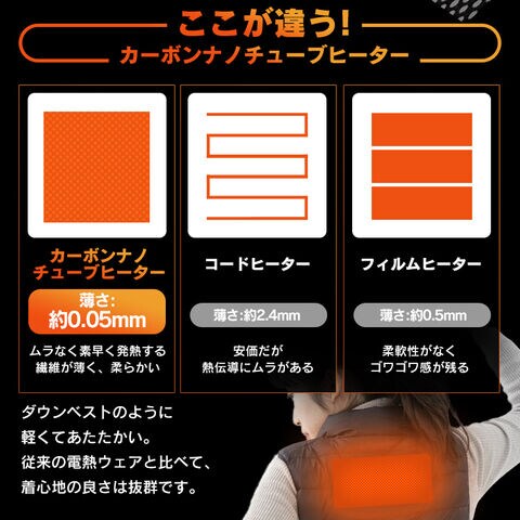 コンセントがない所でもあたたかいヒーター付きベストです。シート状のヒーターのため、着心地を損なわずに着用でき、