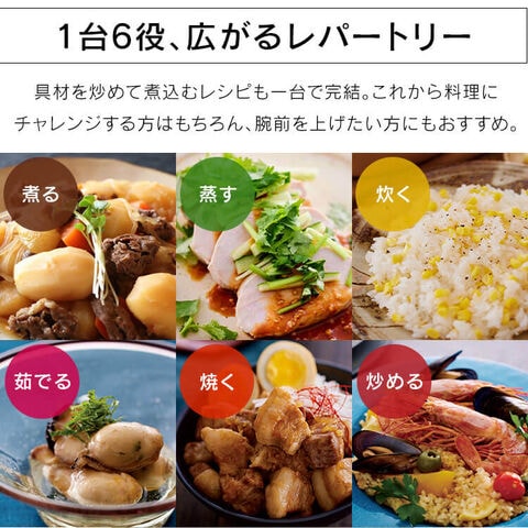 煮る・蒸す・炊く・茹でる・焼く・炒めるの6通りの調理ができます。