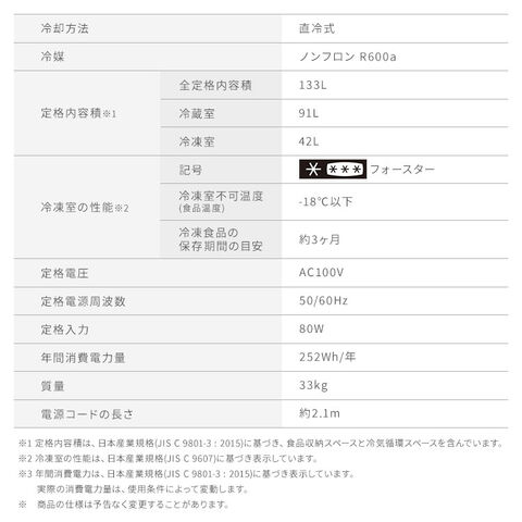 総容量133L[冷蔵庫:91L/冷凍室:42L]。