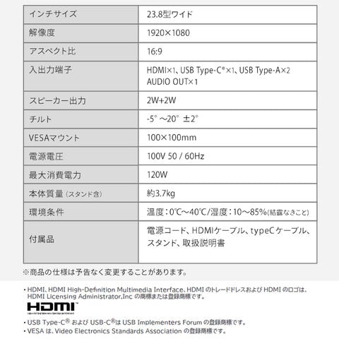 スタンド、取扱説明書、HDMIケーブル、Type-Cケーブル、電源コード