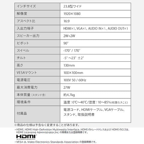取扱説明書、スタンド(支柱、台座)、HDMIケーブル、VGケーブル、電源コード