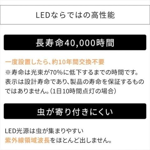 ※寿命は光束が70%まで低下するまでの時間です。表示は設計寿命であり、製品の寿命を保証するものではありません。(1日10時間点灯の場合)