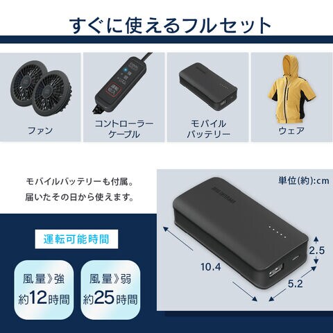 ウェア、ファン、コントローラーケーブル、モバイルバッテリー