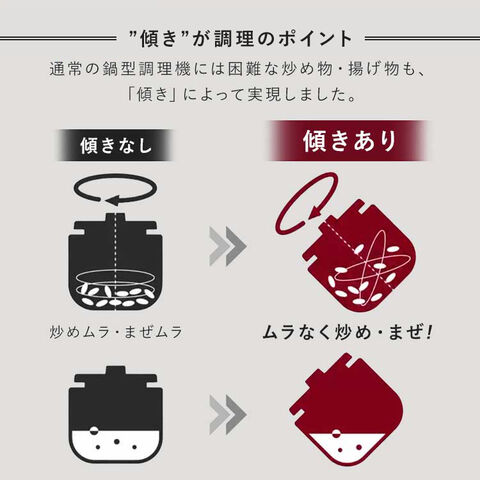 鍋が自動回転して具材を攪拌(かくはん)し、ムラなく加熱。