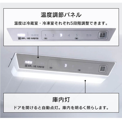 丈夫なガラス棚、小物もすっきりしまえる3段ドアポケット、たっぷり入る野菜ケースなど