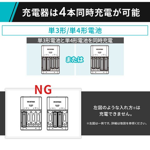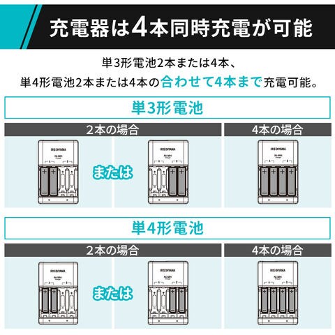 単3形電池2本または4本、単4形電池2本または4本の合わせて4本まで充電可能。