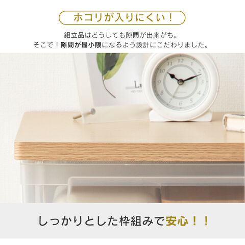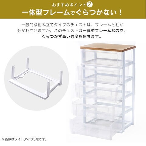 一般的な組み立てタイプのチェストは、フレームと柱が分かれていますが、ウッドトップチェストは一体型フレームなので、ぐらつかず高い強度を保ちます。