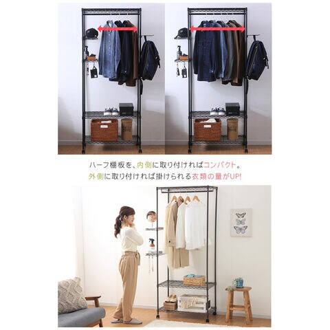 ハーフ棚板を内側に取り付ければコンパクトに、外側に取り付ければ掛けられる衣類の量がUP!