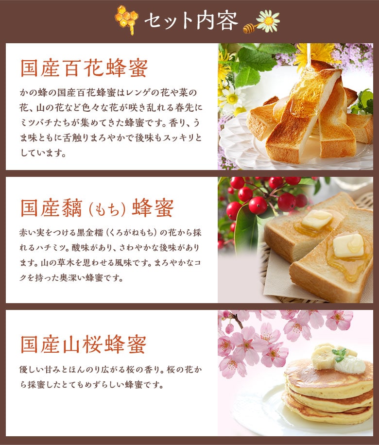 ・国産黐(もち)蜂蜜:135g ・国産山桜蜂蜜:135g ・国産百花蜂蜜:135g ・スプーン付き ※こちらのスプーンは手作りの為、素材・色・大きさ・風合いにばらつきがございます。 |
