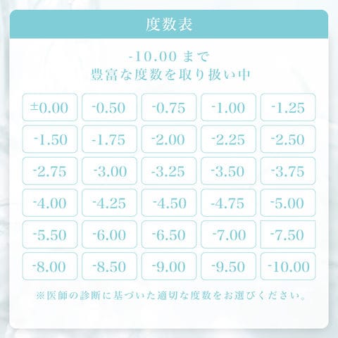±0.00D/-0.50D~-6.00D(0.25Dステップ)/-6.50D~-10.00D(0.50Dステップ) |