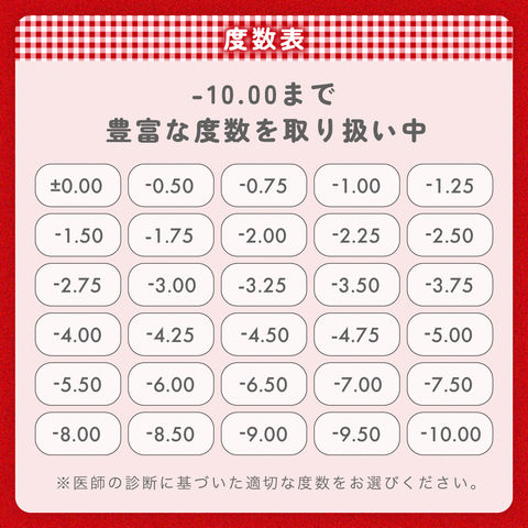 -0.50D~-6.00D(0.25Dステップ)/-6.50D~-10.00D(0.50Dステップ) |