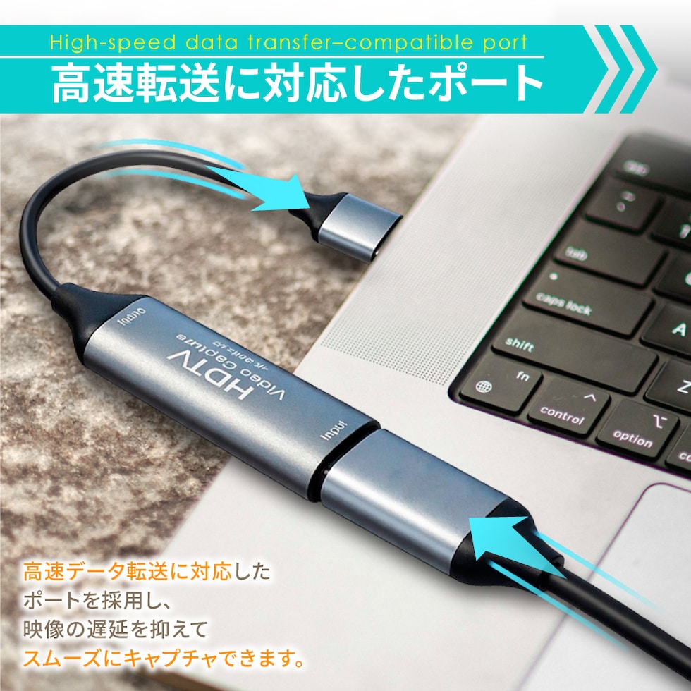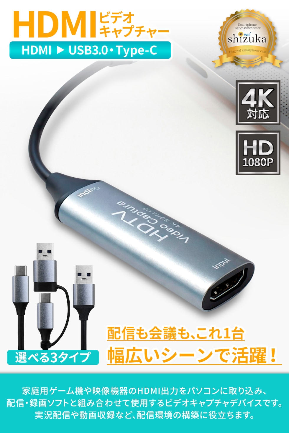 シズカウィル HDMI Type C キャプチャ ビデオキャプチャー データ転送 HD画質録画 HD1080P 4K ゲーム録画 ビデオ録画 ライブ配信 ミラーリング パソコン PC 日本語取扱説明書付き 10cm グレー 1個入り
