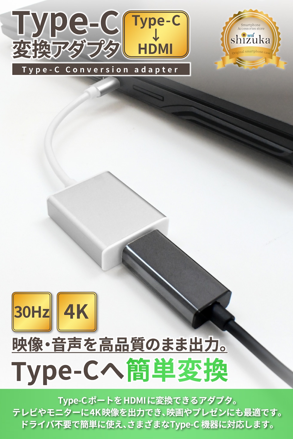 シズカウィル Type-C HDMI 変換アダプタ アダプター コネクタ タイプC 高速転送 4K高画質 4K@30Hz オス メス iPhone アイフォン android アンドロイド iPad タブレット MacBook windows テレビ 接続 モニター シルバー 1個入り