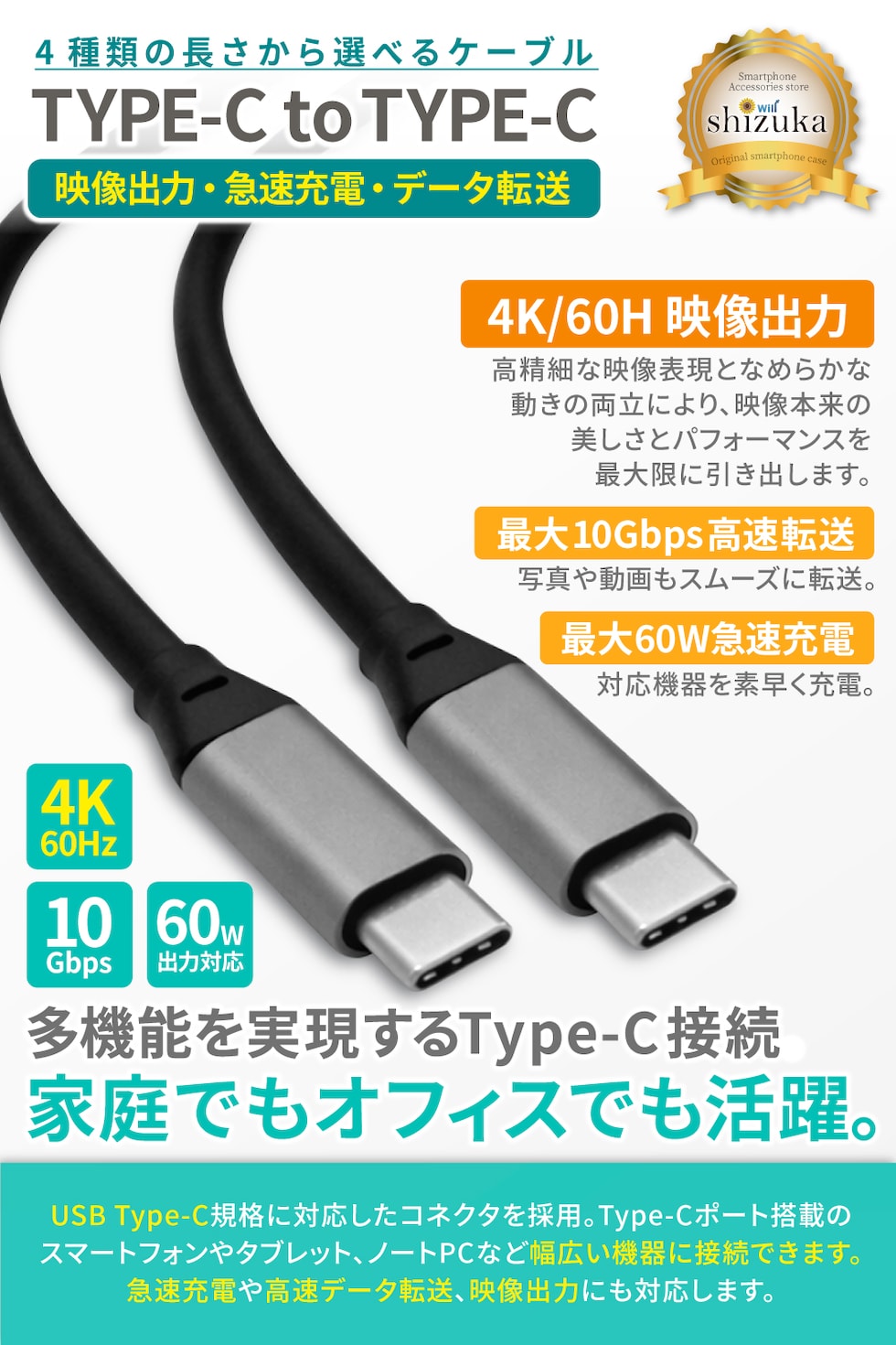 シズカウィル Type C ケーブル データ転送 4K 60Hz 充電ケーブル PVC素材 断線防止 柔らかい テレワーク リモート 在宅勤務 Type-c機種対応 急速充電 映像出力 10G 60W ブラック 1.5m 1個入り