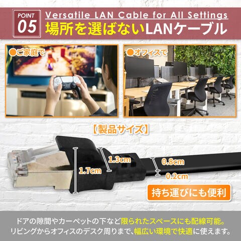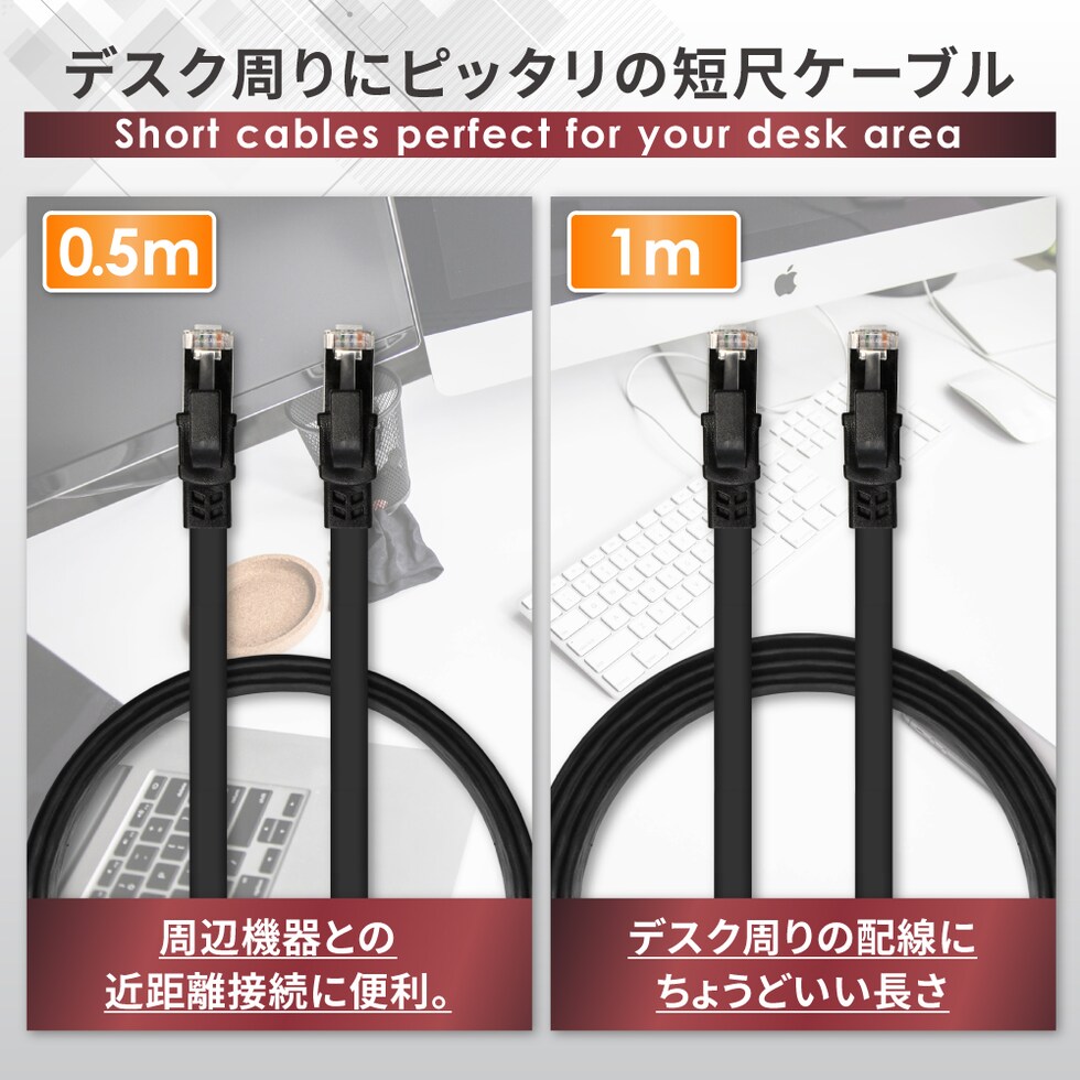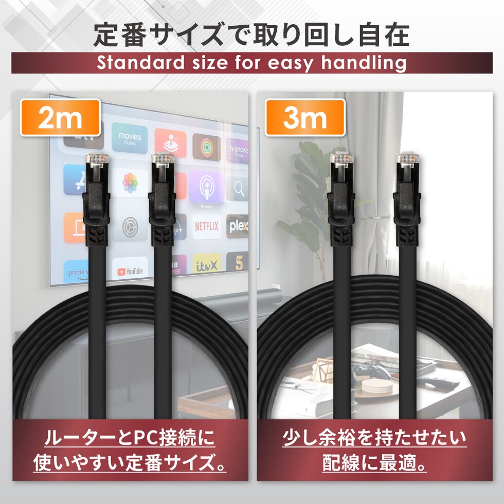 シズカウィル LANケーブル Cat8 40Gbps コネクタ 高速 フラットタイプ カテゴリー8 イーサネットケーブル インターネット ケーブル ブラック 2m 1個入り