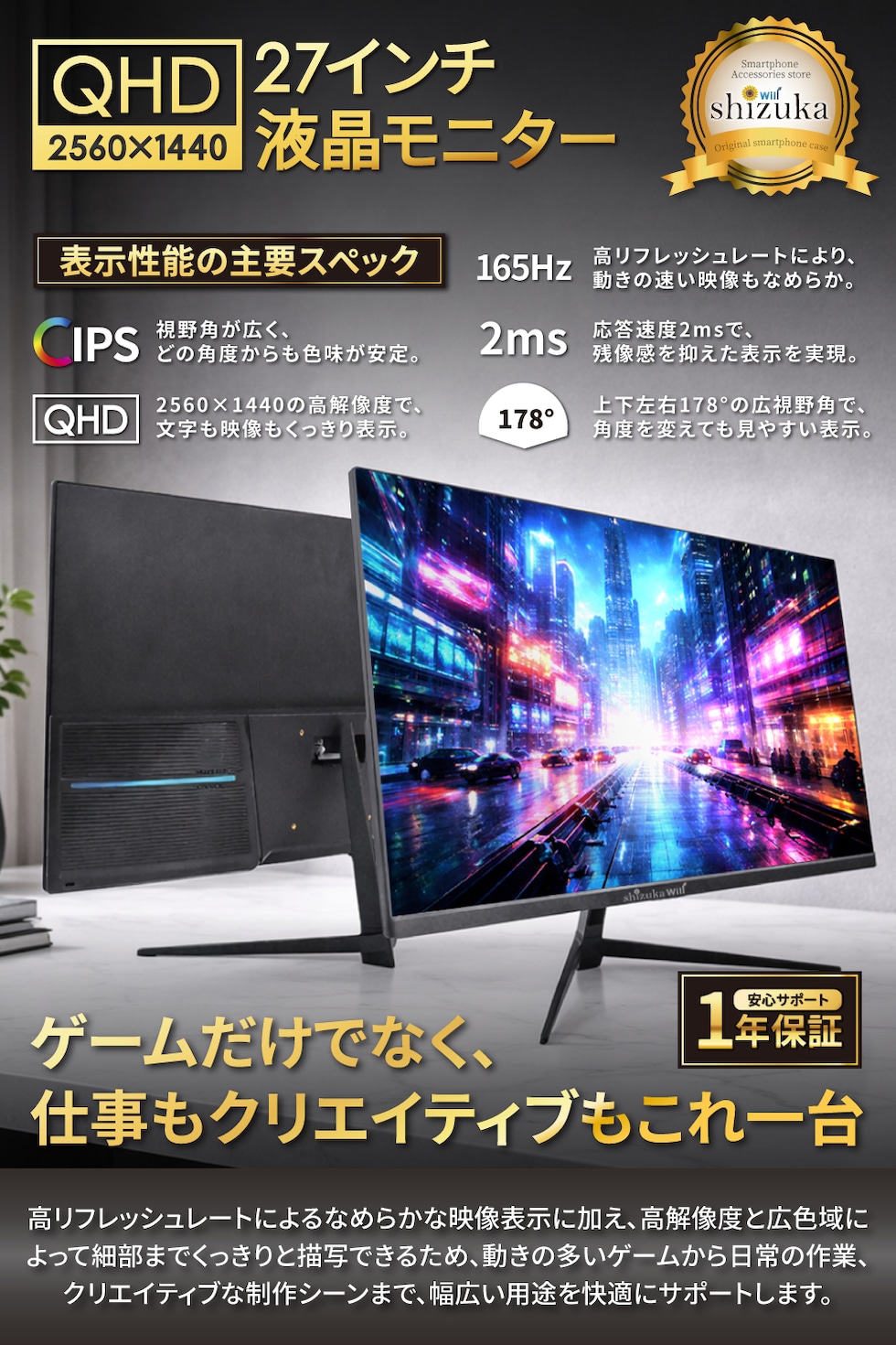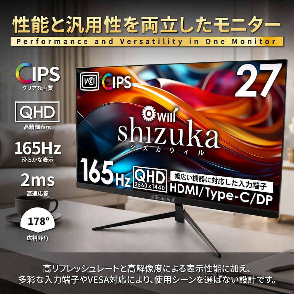 シズカウィル PCモニター 27インチ 液晶ディスプレイ QHD IPSパネル 広視野角 USB Type-C HDMI DisplayPort スピーカー内蔵 VESAマウント対応 ブラック 1個入り