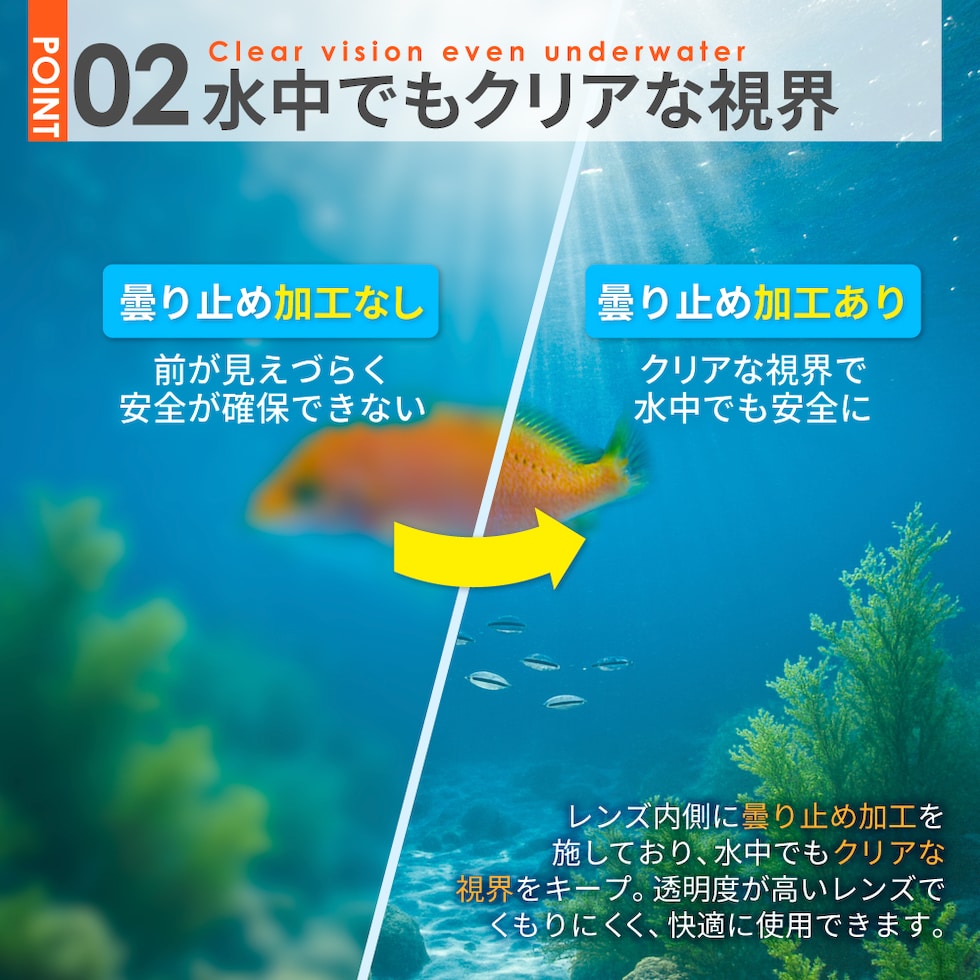 = 透明度の高いレンズの内側にくもり止め加工を施しました。