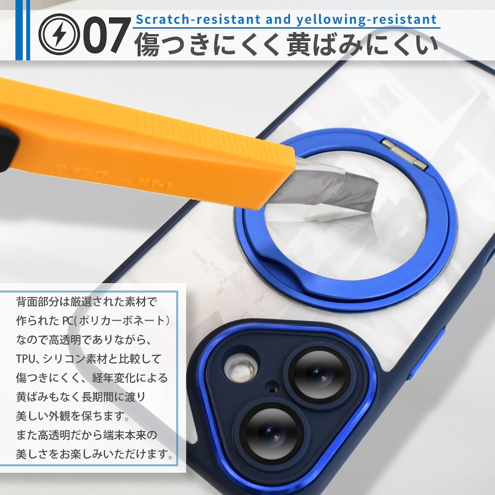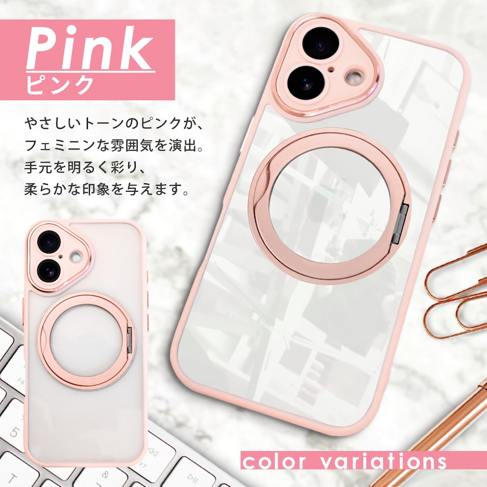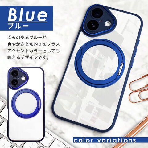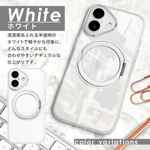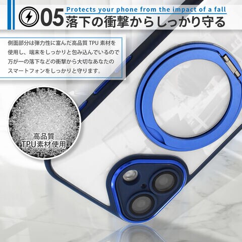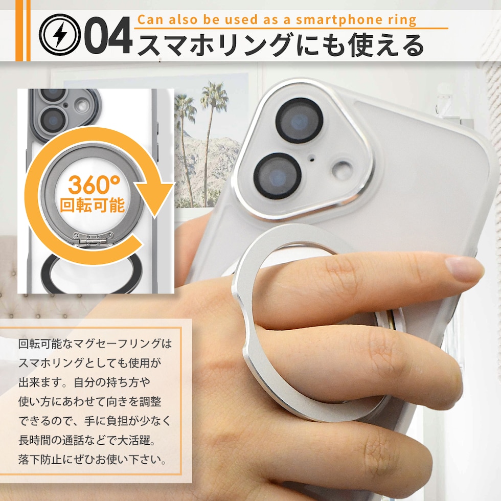 =余裕を持って指を通せる、360°回転するスマホリング付き