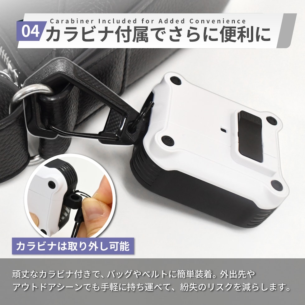 =鞄などにスムーズに付けやすいカラビナを付属