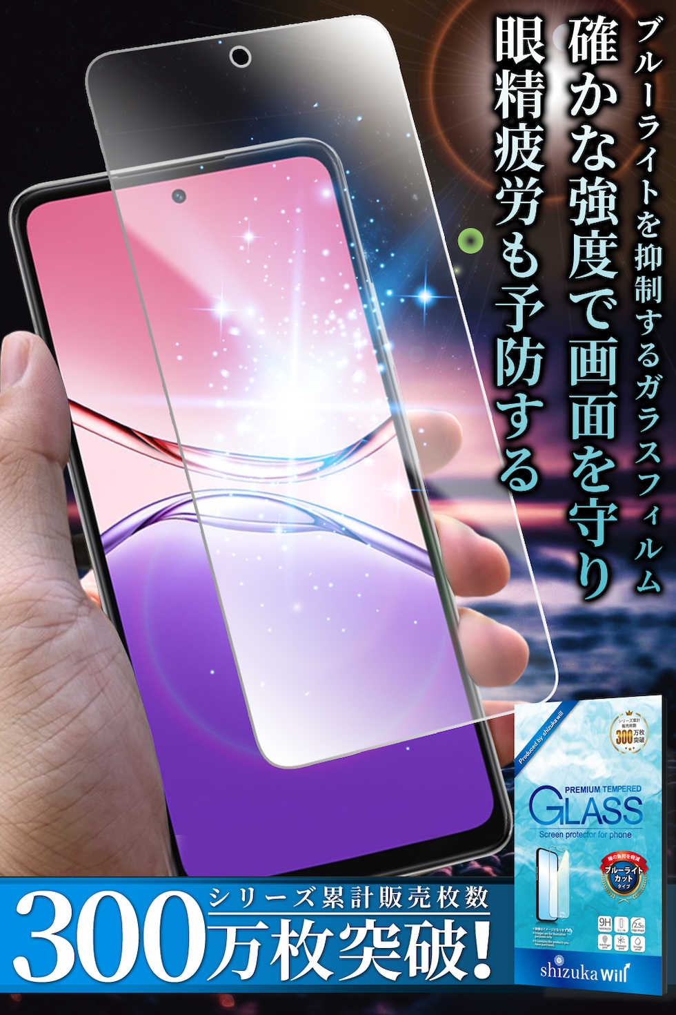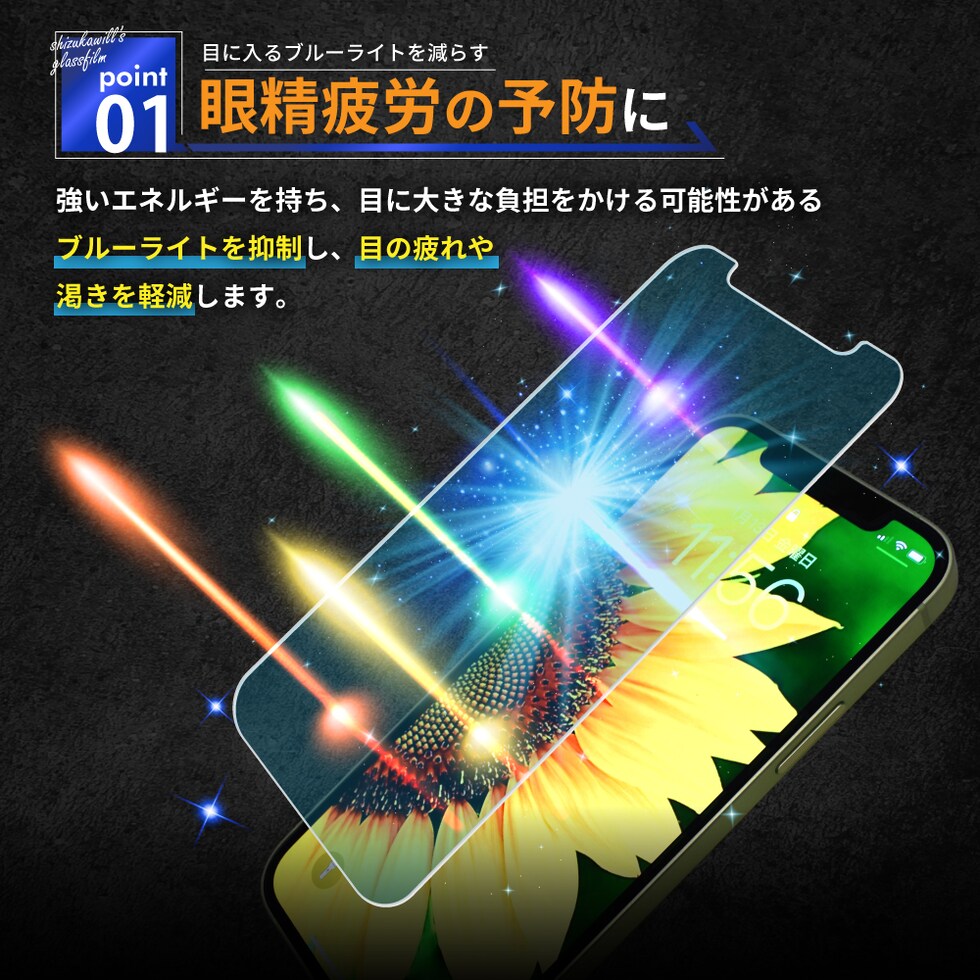 仕様:ブルーライトカット・硬度9H・指紋軽減・飛散防止・付着防止・防汚・耐傷性