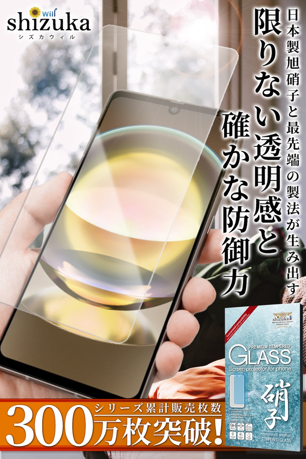 仕様:硬度9H・指紋軽減・飛散防止・付着防止・防汚・耐傷性