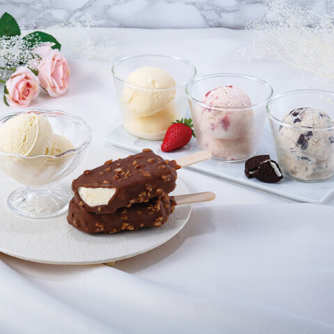 ●ミニカップ(バニラ)110ml×2個、バー(バニラチョコレートマカデミア)80ml×2本、ラバーズアソート(バニラ・ストロベリー・クッキー&クリーム各70ml×2)×1