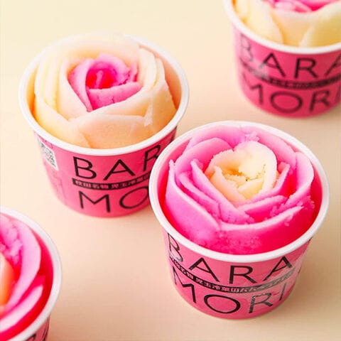 ■バラの花が咲いたように見える「バラ盛り」は機械ではできない熟練の技。ババヘラ職人のおばちゃん(ババ)が、ひとつひとつ手作りでカップに盛り付けています。ピンクがイチゴ、黄色がバナナの風味。児玉冷菓のババヘラアイスの中でも一番人気商品の詰合せです。