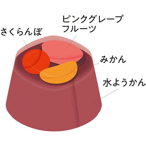 ■北海道産のしゅまり小豆と十勝小豆をブレンドした、なめらかな口溶けの水ようかんに、3種の果実を合わせました。やさしいあんの風味と、果実の酸味や甘みが織り成す、涼やかな味わいをお届けします。