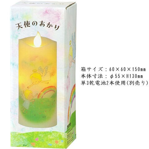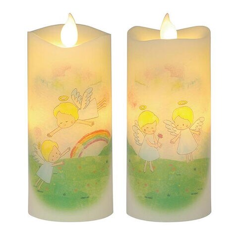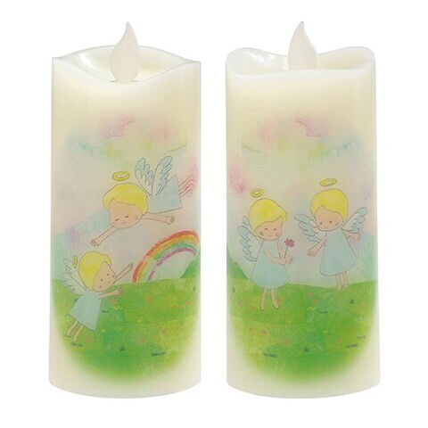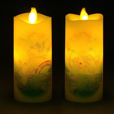 ■本物のロウを使ったリアルな質感と、自然な炎のゆらぎを再現したLEDローソク。ほのかな灯りに可愛らしい虹と天使が浮かんで見る人を癒します。前と後ろで異なる2種のデザインをお楽しみいただけます。インテリアに、供養に、コンパクトなので置き場所を問いません。火を使わないので安心安全にご使用いただけます。