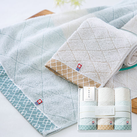 ■タオル産地として、日本一を誇る愛媛県今治市。伝統の技術で織り上げられたタオルは、使いはじめから吸水性がよく、ふんわりした風合いが長続きします。小紋柄をあしらったシンプルなデザインで、シーンを選ばず使いやすいタオルです。
