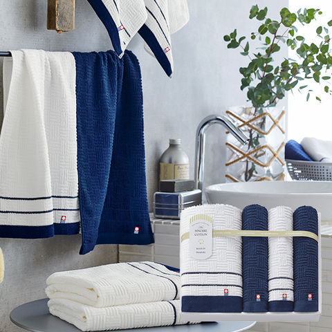 ■ネイビーとホワイトのコントラストが美しい高級感のあるタオル。フォーマルでも映えるシックでモダンなデザインが自慢です。