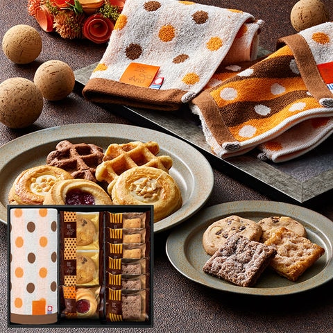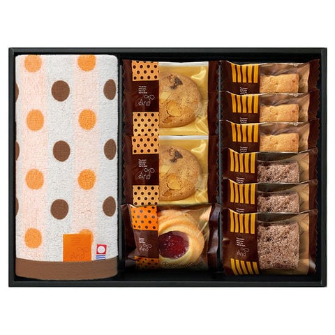 ■ドット柄がキュートな今治タオルと洋菓子ギフト。やさしい色合いのドット柄の今治タオルと洋菓子を一緒にお届けします。