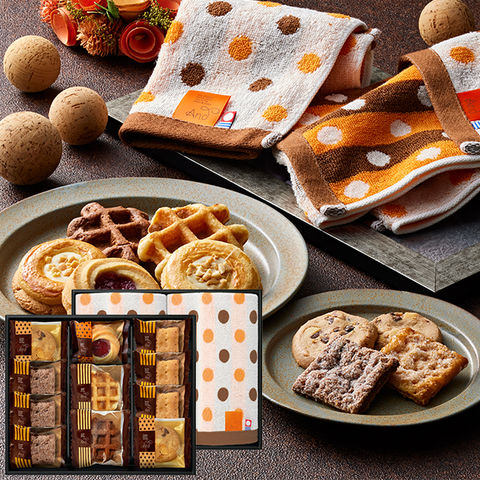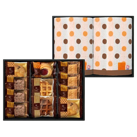 ■ドット柄がキュートな今治タオルと洋菓子ギフト。やさしい色合いのドット柄の今治タオルと洋菓子を一緒にお届けします。