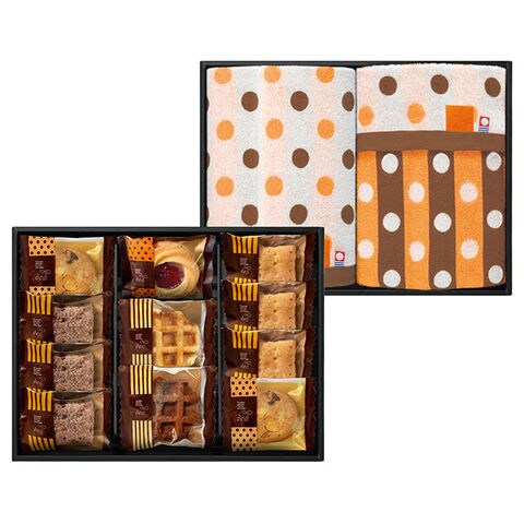 ■ドット柄がキュートな今治タオルと洋菓子ギフト。やさしい色合いのドット柄の今治タオルと洋菓子を一緒にお届けします。