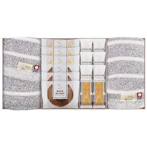 ●バウムクーヘン(ココア・バニラ)×各3、スティックパイ(プレーン)×6、ウォッシュタオル(約34×35cm・綿100%)、フェイスタオル(約34×75cm・綿100%)