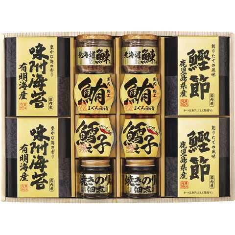 ●北海道産鰊フレーク50g×2、焼きのり入佃煮85g×2、鹿児島県産鰹節(2g×3)×2、有明海産味附海苔(8切10枚入)×2、まぐろ油漬け70g×2、鱈之子味付け70g(固形量45g)×2