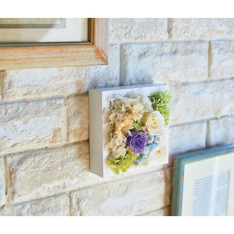 ■壁掛け型の優しい色目の可憐なプリザーブドアレンジ。お花とともに心癒されるひと時を…
