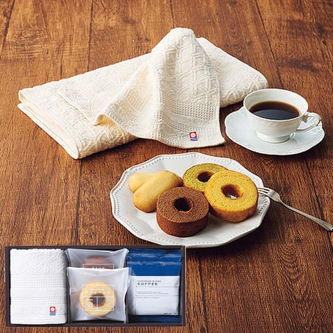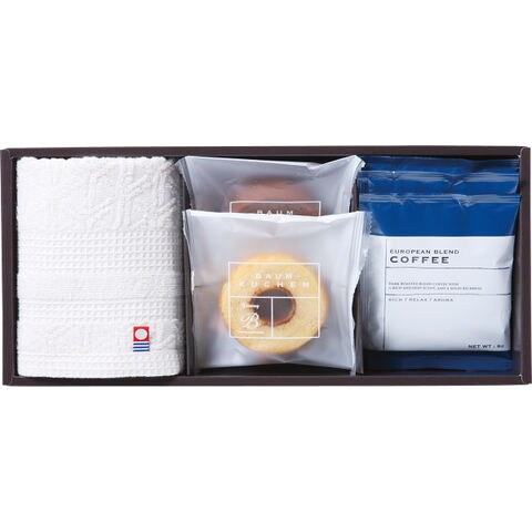 ●今治産ウォッシュタオル(約34×35cm・綿100%・日本製)1枚・ミニバウム(バニラ×1・チョコ×1)・ドリップコーヒー8g×3